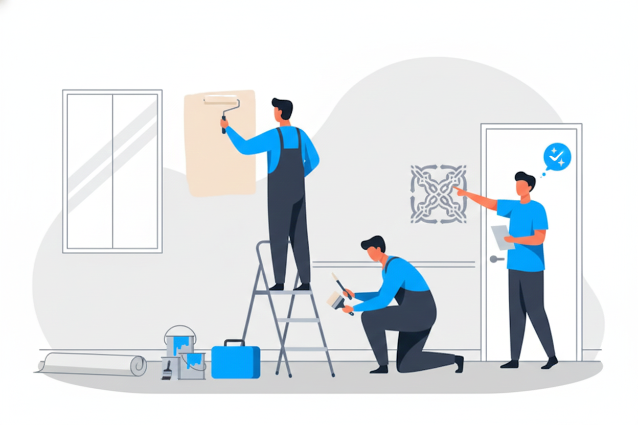 Réparation fissures et imperfections, pose de toile de verre / fibre de verre, enduit et ratissage des murs, reprise des joints et finitions.